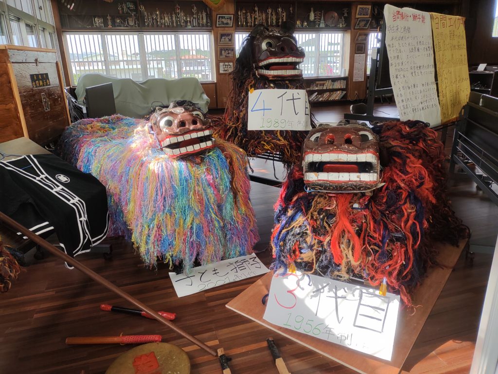 当間の獅子たち。ちなみに初代は1790年代に制作されたものの戦時中に消失、2代目は1930年代に制作されたものの火葬にて消失、3代目は1956年に制作され1989年に大里村(現在の南城市)に寄贈され無形文化財となり、4代目は現在、当間区で保管されているそうです。